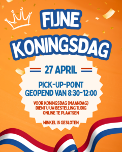Voor Koningsdag (maandag a.s) kunt u uw bestelling online plaatsen. Let wel: u dient uw bestelling in de ochtend (8.30 - 12.00 uur) bij ons PICK-UP-POINT (zijkant winkelpand) op te halen